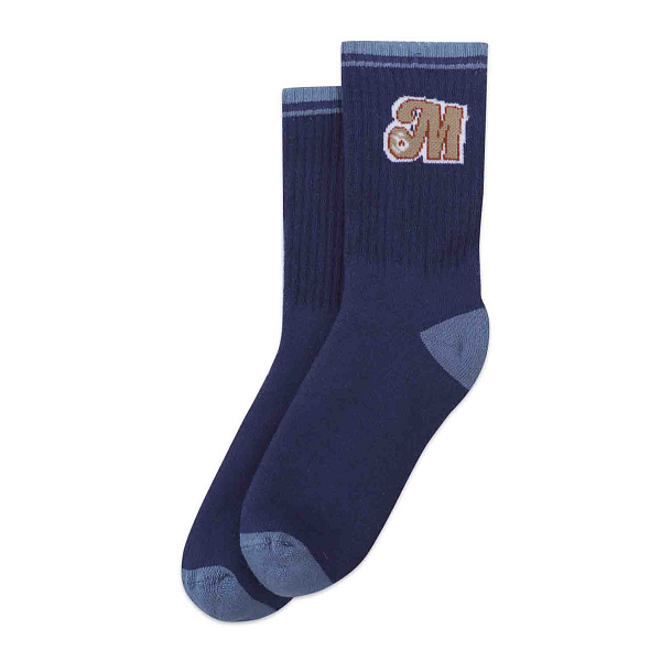 Цвет носков — насыщенный синий, дополненный контрастной голубой вставкой на мыске и пятке, а также крупной буквой «M» на боковой стороне — все это придает изделию спортивный и современный вид. Материал хорошо держит тепло, не растягивается и сохраняет форму даже после многократных стирок. Удобная резинка на манжете не сдавливает ногу, а гладкая текстура приятна на ощупь. Простой дизайн и качественные материалы делают эти носки надежным выбором для школы, прогулок и дома в холодное время года.
