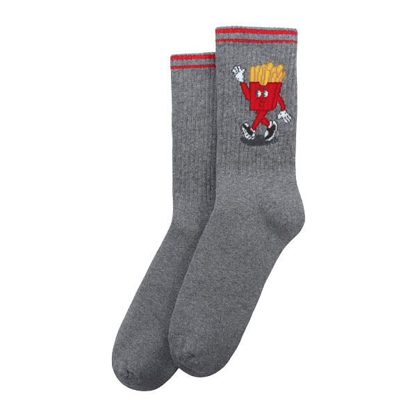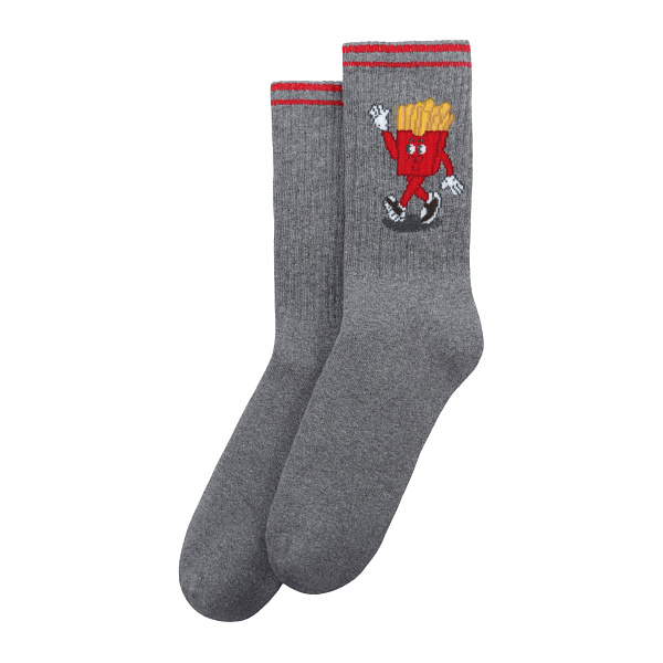 Эти теплые носки представлены в универсальном сером цвете, украшенном ярким и игривым принтом – шагающей упаковкой картофеля фри с приветственно поднятой рукой, что добавляет оригинальности образу. Верхняя часть носков дополнена контрастными красными полосками на рифленой резинке, которая обеспечивает комфортную и надежную фиксацию, не сдавливая ногу.