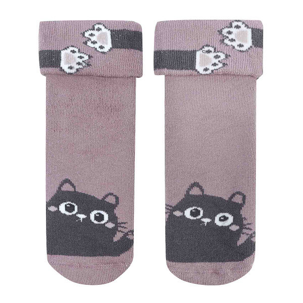Носки сиреневого цвета украшены милым рисунком с изображением забавной черной кошечки и лапок, что делает их привлекательными для девочек и добавляет игривый акцент в образ. Эластичный отворот обеспечивает надежную фиксацию и дополнительный комфорт.