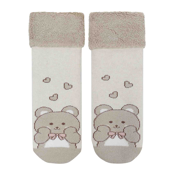 Носки украшены милым рисунком с изображением медвежонка и сердечками, а также имеют уютные отвороты из махрового материала, которые добавляют дополнительное тепло и комфорт. Состав с добавлением полиамида и эластана обеспечивает эластичность и хорошую посадку на ноге.
