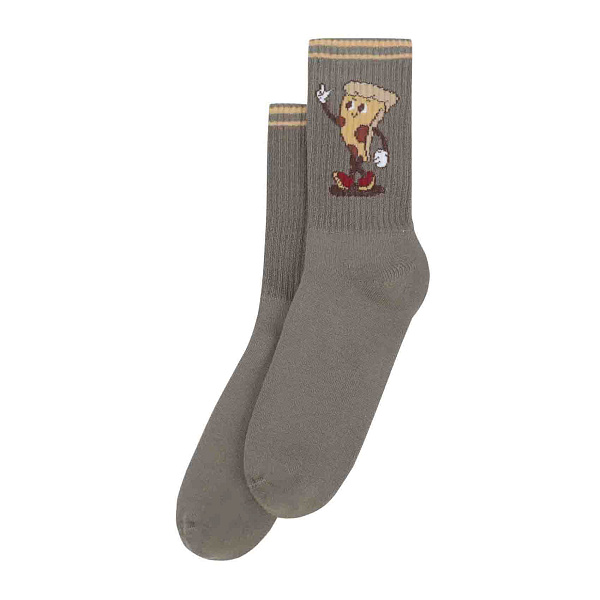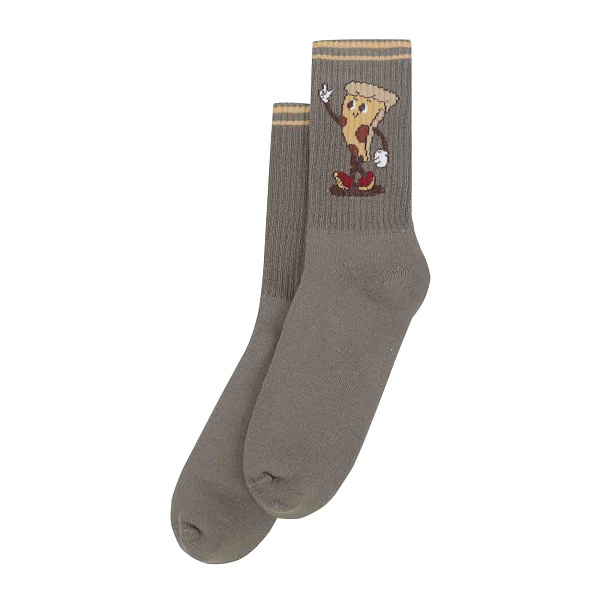Теплые носки выполнены в цвете хаки и украшены забавным рисунком в виде приветствующего кусочка пиццы, что придает им оригинальность и привлекательный вид. Модель имеет классическую посадку с облегающим верхом и плотной текстурой для дополнительного комфорта и удержания тепла.