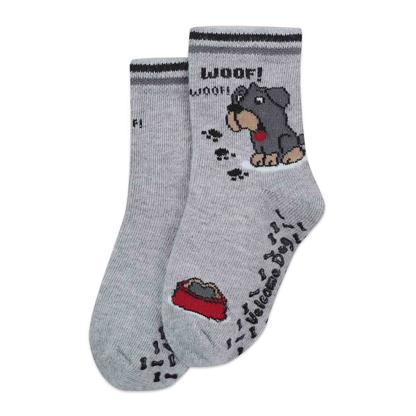 Теплые носки для мальчиков выполнены в светло-сером цвете с забавным и ярким принтом в виде милой собачки, сопровождаемой надписью «WOOF» и следами лап, а также изображением миски для корма. Модель обладает комфортной и эластичной посадкой, обеспечивая удобство и тепло в холодное время года.