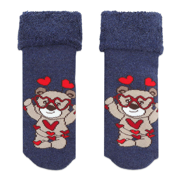 Синие утепленные носки предназначены для девочек. На них нанесен принт с мишкой в очках. Внутри поверхность мохровая. Это помогает в холодную погоду. Дизайн яркий и милый. Носки подходят для повседневной носки. Они эластичные благодаря эластану. Хлопок делает их мягкими. Полиамид добавляет прочности.