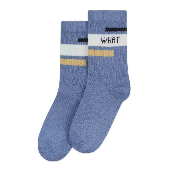 Теплые носки для мальчиков выполнены в голубом цвете с оригинальным дизайном, включающим полосы черного и желтого цветов и надписью «WHAT» на манжете. Модель отличается удобной и плотной посадкой благодаря эластичному вязаному материалу, который обеспечивает комфорт и поддержку стопы в течение всего дня.