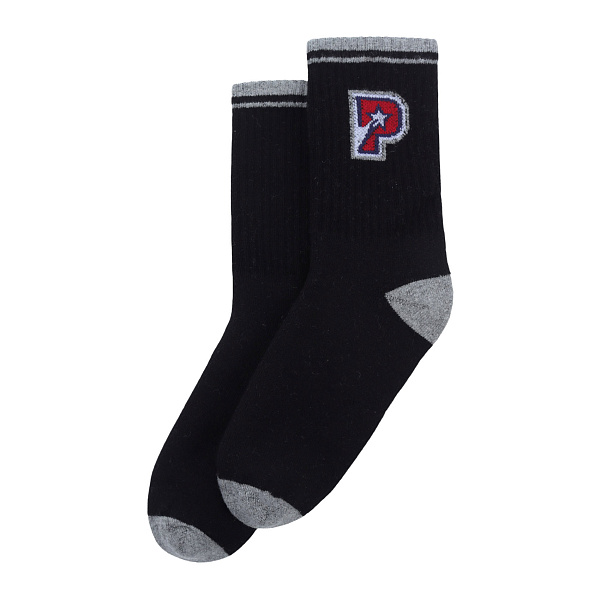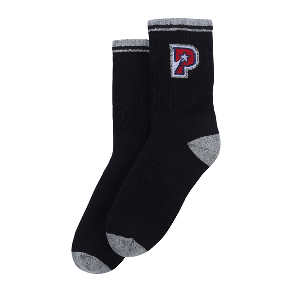 Утепленные носки для мальчика имеют черный цвет. Основная часть выполнена из эластичного текстиля. Серые вставки есть на манжетах и в области носка. На боку носка размещен вышитый логотип в форме буквы P с красной звездой. Носки подходят для холодной погоды. Они надеваются легко и сидят плотно.