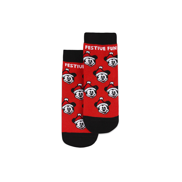 Детские носки в праздничном дизайне станут приятной деталью костюма для домашней новогодней вечеринки или на утренник в учреждение. Они выполнены в ярком красном цвете, декорированы рисунками Микки Мауса в колпаке. Черный мысок и пятка интересно контрастируют с основным цветом, в то же время добавляя изделию практичности.