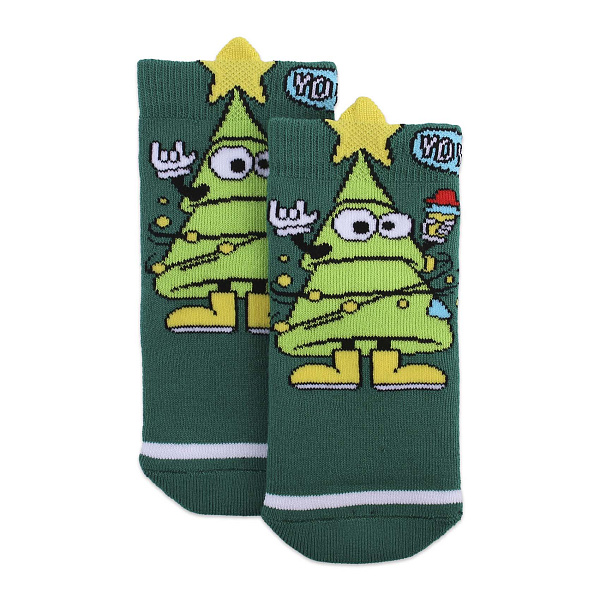 Детские носки зеленого цвета украшены ярким новогодним принтом, добавляющим праздничного настроения. Изображение елочки и звездочки создает игривую и веселую атмосферу, идеально подходящую для зимних праздников.