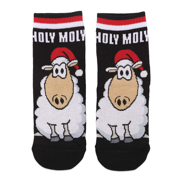 Детские носки «Conte-kids» выполнены в черном цвете с ярким и забавным принтом, изображающим овечку в шапке Санты и надписью «HOLY MOLY». Этот дизайн добавляет игривости и праздничного настроения в повседневный образ.