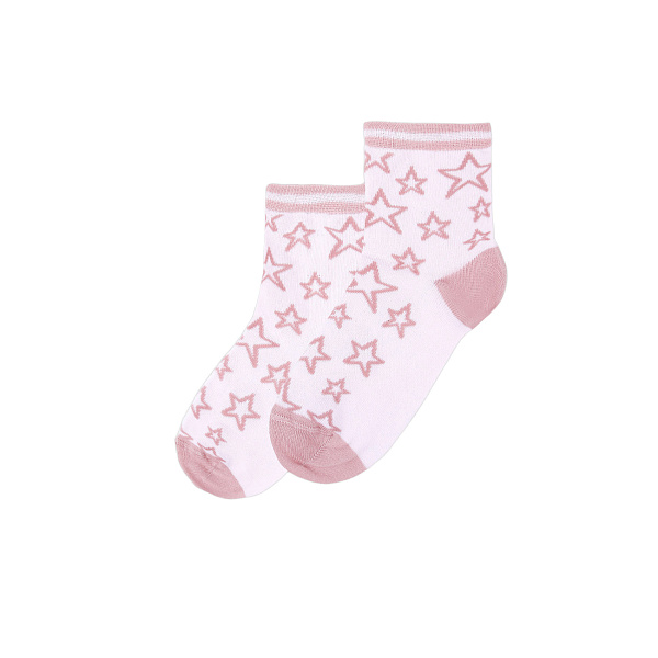 У изделия оригинальный дизайн. Нежно-розовый фон украшают крупные звезды. Пятка и мысок выполнены в том же цвете, что и рисунок. На щиколотке есть дополнительная мягкая резинка в полоску.