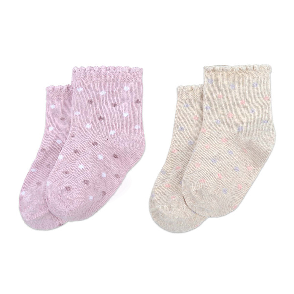 Набор из двух пар носков для девочек выполнен в мягких и нежных оттенках: нежно-розовом и светло-бежевом. Каждая пара украшена мелким гороховым рисунком в разных цветах, придающим изделию игривость и легкость. Манжеты имеют аккуратный волнистый край, который обеспечивает удобную посадку и не сдавливает ножку при ежедневной носке.