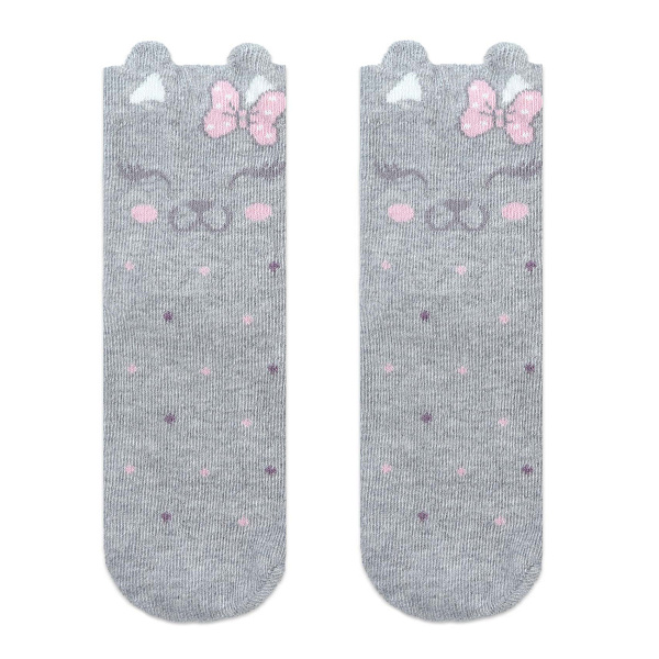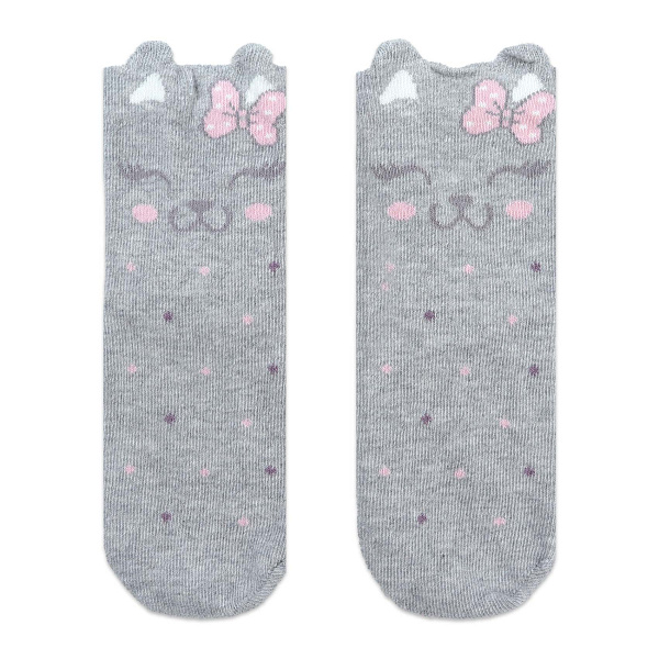 Носки для девочки имеют серый цвет. На них изображено милое кошачье лицо с закрытыми глазами и носиком. Ушки торчат сверху. Розовые бантики украшают ушки. Носки сделаны из мягкого материала. Они подходят для повседневной носки. Носки тянутся и надеваются легко.