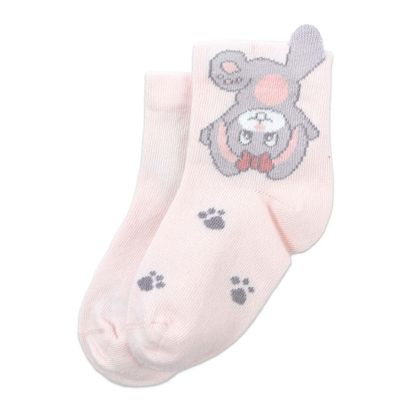Носки для девочки выполнены в розовом цвете. На них изображен серый зайчик с бантиком. Зайчик висит вниз головой. По ткани разбросаны серые следы лапок. Дизайн выглядит мило и игриво.