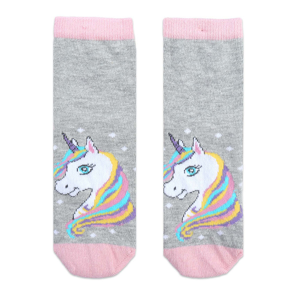 Носки предназначены для девочек. Они имеют серый цвет. На носках изображен белый единорог с радужной гривой. Носки сделаны из хлопка, полиамида и эластана. Материал мягкий на ощупь. Они подходят для повседневной носки. Каждый носок украшен единорогом сбоку.