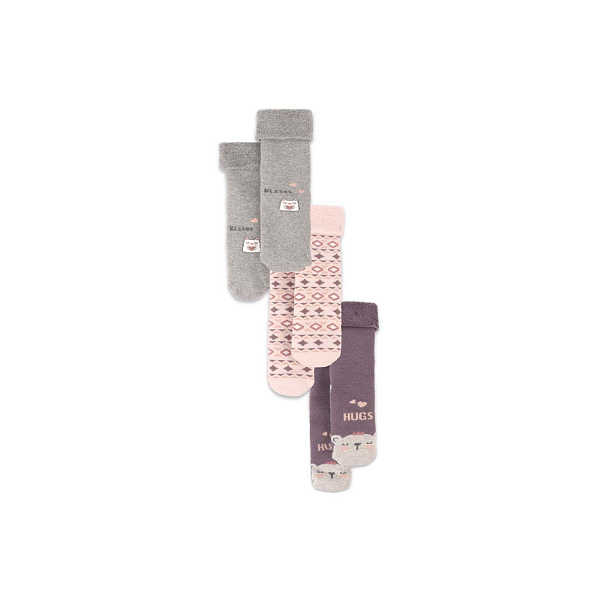 Детские теплые носки для девочек фиолетового цвета. Мысок модели украшает изображение милого спящего медвежонка серого цвета. Внутри есть махровый мягкий слой, обеспечивающий комфортную посадку и сохраняющий тепло. Ребенок сможет носить эту трикотажную пару дома или на улице. Она защит его ноги от сквозняков и холода.