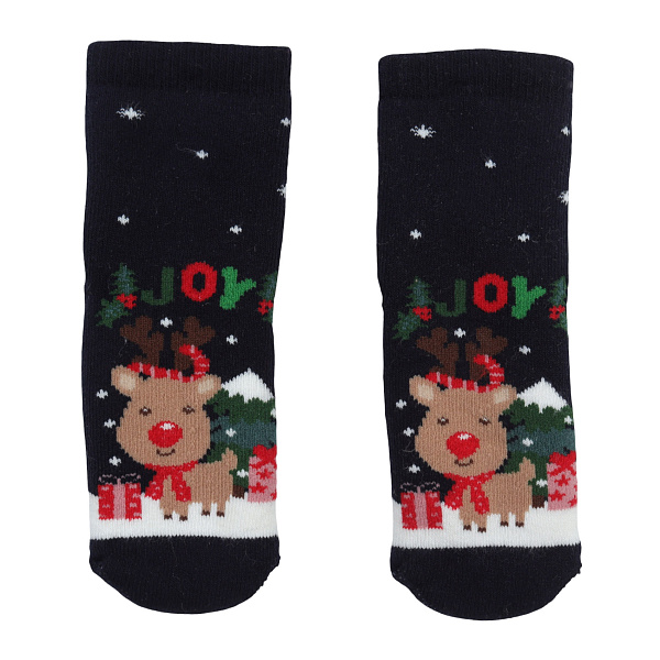 Теплые носки для мальчика подходят для зимнего сезона. Они сделаны из хлопка и эластана. Принт на носках показывает оленя с красным носом, елки и снег. Носки синие с белыми вставками у верха. Носки изготовлены из 80% хлопка, 18% полиамида, 2% эластана. Они эластичные и держат форму. Материал мягкий на ощупь. Дизайн вдохновлен Новым годом.