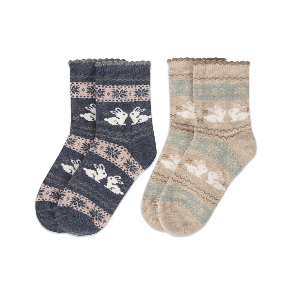 Теплые носки для девочек защитят ноги ребенка от холода и сквозняков. Изделие бежевого оттенка с оригинальным орнаментом в виде белых зайцев, цветов и геометрических линий. Нейтральная цветовая гамма будет хорошо сочетаться с разными вариантами одежды.