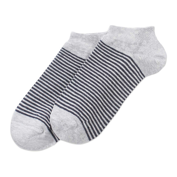 Серые носки для мальчика выполнены в универсальном дизайне с тонкими горизонтальными полосками чёрного цвета, что придаёт им стильный и сдержанный вид. Носки имеют короткую длину, удобно облегающую щиколотку, что делает их подходящими для повседневной носки в теплое время года.