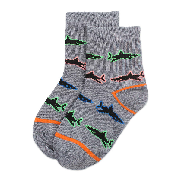 Серые носки с принтом «Акулы» прекрасно дополнят гардероб мальчика. Яркие изображения акул добавят немного веселья и оживят любой наряд. Эластичный материал и мягкая резинка позволяют носкам надежно сидеть на ногах, не причиняя неудобств. Дышащий материал из хлопка сохраняет комфортный микроклимат в течение всего дня.