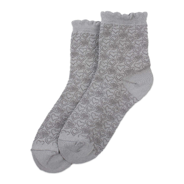Носки серого цвета с изящным узором создают стильный и выразительный образ. Верхняя часть украшена аккуратными рюшами, которые добавляют нежности и легкости в общий дизайн. Такие носки отлично дополнят повседневный и праздничный гардероб.