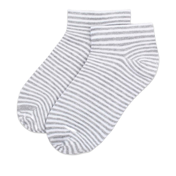 Короткие полосатые носки для детей отлично подойдут для ежедневного ношения. Белый цвет с серыми полосками добавляет свежести и игривости образу. Эластичный материал и мягкая резинка не сдавливают ногу. Это создает легкость и свободу движений во время активных игр и прогулок. Большой процент хлопка в составе обеспечивает хорошую вентиляцию. Это способствует циркуляции воздуха и отводу влаги.
