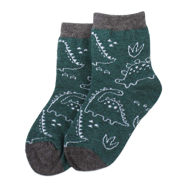 Носки зеленого цвета с веселым рисунком динозавров создают забавный и интересный образ. Яркий узор привлечет внимание и подарит хорошее настроение в любой день. Мягкая и теплая ткань сохраняет комфорт даже в прохладную погоду.