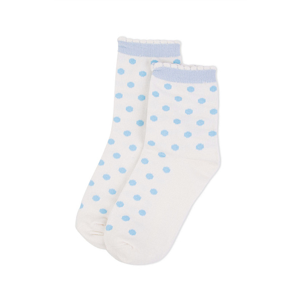 Праздничные носки для девочек белого цвета с голубыми горошками. Резинка носков украшена белыми зубчиками, фигурный край подчеркивается благодаря голубой полоске. Мягкие и приятные носки мягкие и комфортные для использования. Хлопок позволяет коже дышать. Носки прослужат долго благодаря добавке из полиэстера. Носочки плотно сидят на ноге и не сползают даже во время активных игр. Такой эффект обеспечивает спандекс, который добавлен в состав в небольшом количестве. Размер носков подходит для стопы 18-20 размера.