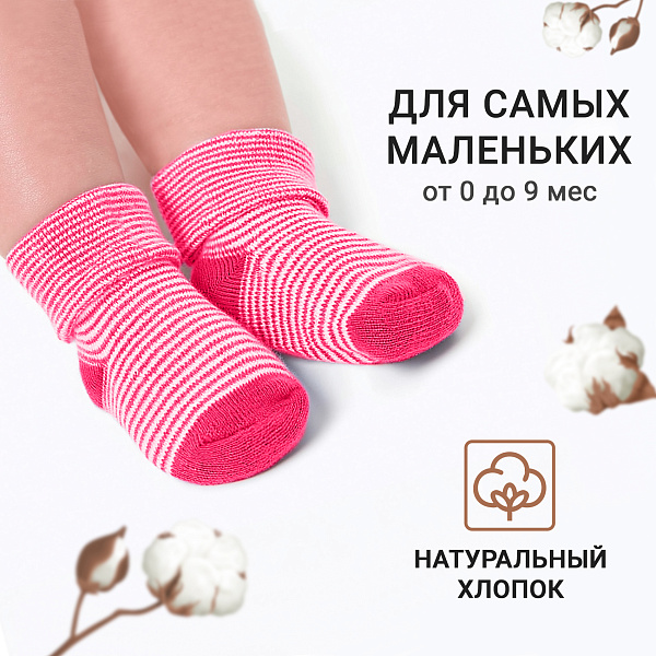 Детские носки в контрастные было-розовые полосы не только согреют ноги ребенка, но и обеспечат комфорт в течение дня благодаря своим материалам – в составе мягкой и приятной на ощупь ткани использован натуральный хлопок 75%, полиэстер 23% и эластан 2%. Такое сочетание делает носки комфортными и приятными к телу, они не сковывают движения и эластичные. Резиновый отворот наверху носков плотный и хорошо держит изделие на стопе, не давая сползать. Носовая часть, пятка и резинка выделены отдельным цветом – ярко-розовым. Рекомендовано для детей ясельного возраста.
