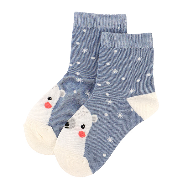 Детские носки выполнены в нежно-голубом цвете с изображением милого белого медвежонка. Вкрапления снежинок добавляют образу очаровательные зимние нотки, создавая атмосферу теплоты и уюта.