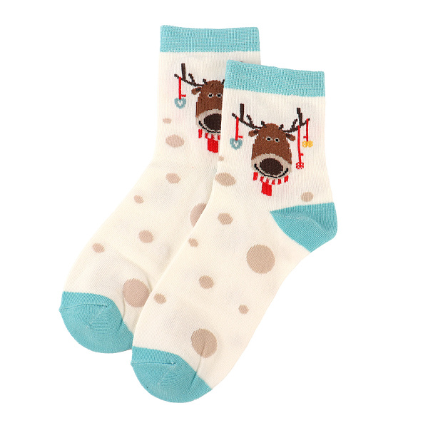 Детские носки выполнены в белом цвете с яркими красными и голубыми акцентами. Изображение милого олененка с веселыми украшениями добавляет изделию праздничную атмосферу, создавая иллюзию волшебства и радости.