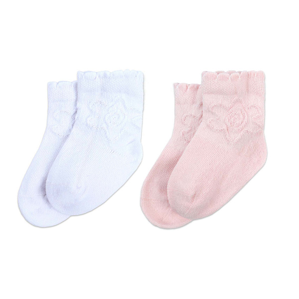 Набор из двух пар носков для девочек выполнены в нежно-розовом и белом цветах, придающем образу нежность и утонченность. Изделия украшены изящным узором в виде цветка, связанного из той же мягкой нити, что создает деликатный и аккуратный декоративный акцент. Манжеты с волнистым краем обеспечивают комфортную посадку и не сдавливают кожу при ежедневной носке. Носки изготовлены из хлопка, что гарантирует высокую гигроскопичность, мягкость и приятные тактильные ощущения. Натуральный материал обеспечивает хорошую воздухопроницаемость, позволяя коже дышать и предотвращая перегрев. Изделия легкие, гипоаллергенные и подходят для длительной носки.
