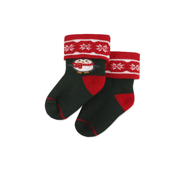 Детские новогодние носки порадуют малышей своими яркими цветами и праздничным оформлением. Изделие сочетает в себе самые популярные рождественские оттенки: зеленый, красный и белый. Сбоку их украшает изображение забавного пингвина в шарфе. На объемном голенище рисунок в виде снежинок.