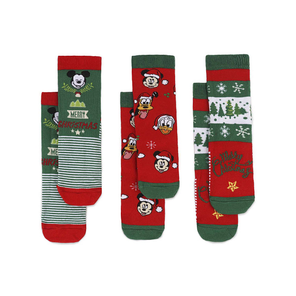 Новогодние хлопчатобумажные носки подарят детям ощущение приближающегося праздника. Они выполнены в классической рождественской цветовой гамме: сочетание зеленого, красного и белого оттенков. Спереди изделие украшает рисунок веселого Микки Мауса и поздравление с праздником.