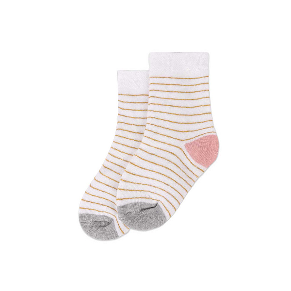 Изделие красиво оформлено – по белому полю идут золотистые полоски, пятка выделена оранжевым цветом, а мысок – серым. В прохладную погоду в таких носках можно выводить ребенка на прогулку, не опасаясь холодов.