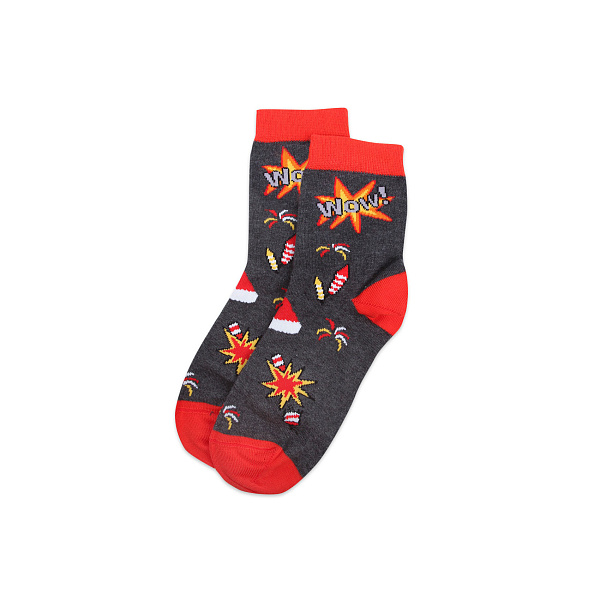 Оригинальные теплые носочки для ребенка младшего возраста привлекают внимание практичным сочетанием цветов и тематическим дизайном. Девочки и мальчики одобрят узкие полоски, рисунок Деда Мороза и символы фейерверков. Изделие подарит хорошее настроение всем членам семьи задолго да начала новогодних праздников. Эластичный трикотаж на основе хлопка, полиамида и эластана хорошо сохраняет тепло, не мешает естественному воздухообмену, приятен на ощупь. Широкая резинка не ограничивает кровообращение, надежно удерживает носок на ноге даже при активных играх.