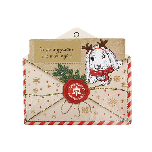 Теперь украсить еловые ветки можно не только красочными украшениями, но и секретными предсказаниями. Украшение выполнено в виде красочного конверта, его поверхность украшена снежинками и новогодней окантовкой. Миниатюрный конверт из волшебной почты содержит внутри небольшое письмо с секретным полем. Сотрите золотую пленку на поле, чтобы получить предсказание. Важное условие – сотрите покрытие ровно 31 декабря, иначе предсказание не сбудется! В верхней части конверта расположена золотая петелька, с помощью которой письмо с предсказание будет висеть на елке и радовать глаз.