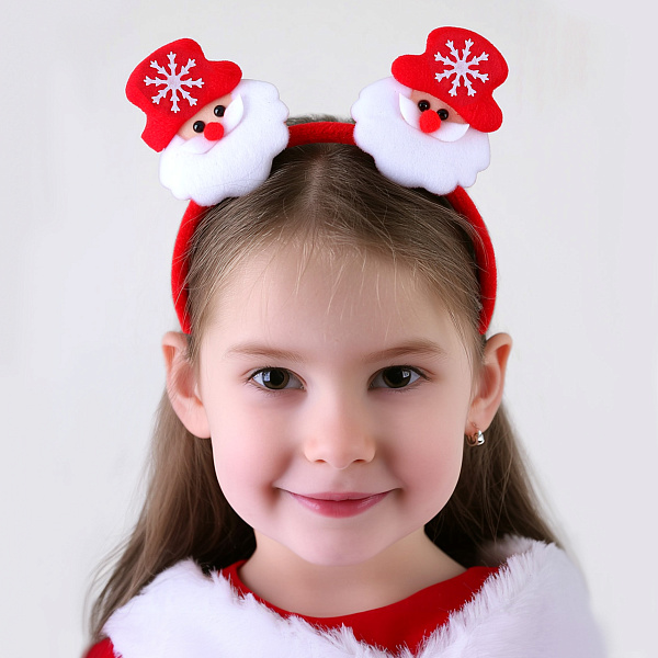 Ободок из пластика — яркий и веселый праздничный аксессуар, выполненный в красном цвете с декоративными элементами в виде двух улыбающихся Санта-Клаусов. Каждая фигурка украшена белой пушистой бородой, красным носиком и красной шапкой с белой снежинкой. Ободок легкий и удобный в носке, отлично подходит для создания новогоднего настроения и праздничного образа на вечеринках, фотосессиях и детских праздниках.