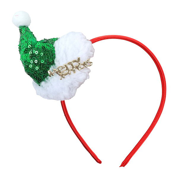 Ободок с колпаком — яркий праздничный аксессуар, выполненный из пластика с красным покрытием. На ободке закреплен зеленый блестящий колпак, украшенный пайетками и обрамленный белым пушистым мехом с золотистой декоративной надписью. Легкий и удобный в носке, этот ободок станет отличным дополнением новогоднего или тематического костюма, придавая образу игривый и праздничный характер.