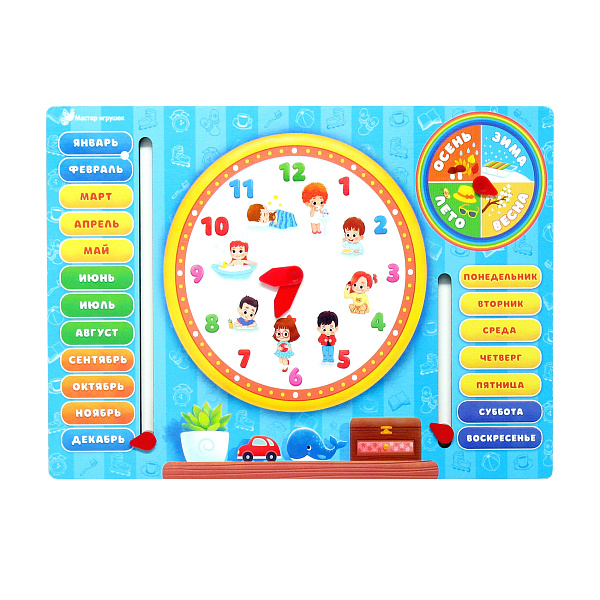Пример полезной и в тоже время экологичной игрушки для детей в возрасте от 1 до 5 лет, которая предназначена для развития памяти ребенка, логики, расширения кругозора. Обучающая игрушка представляет собой деревянную доску с нанесенным на нее красочными рисунком, а также пазами с бегунками и стрелками. В формате игры предполагается обучить ребенка временам года, используя специальный кружок с секторами, имеющими определенный цвет и вспомогательные рисунки. Для изучения месяцев, которые соответствуют каждому времени года, также предусмотрены цветовые подсказки. На доске представлены дни недели с выделенными выходными, чтобы было проще запоминать. Яркий циферблат часов дополнен рисунками с распорядком дня, чтобы малышу было легче ориентироваться во времени и научиться быстро его определять.