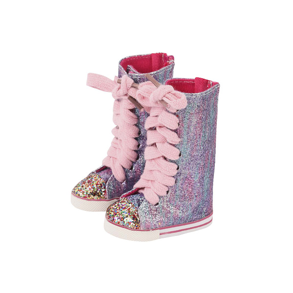 Высокие розовые блестящие кеды предназначены для куклы. Игрушечная пара мягкой текстильной обуви поможет развить моторику пальцев и внимание, побольше узнать о предметах быта и культуре одежды.