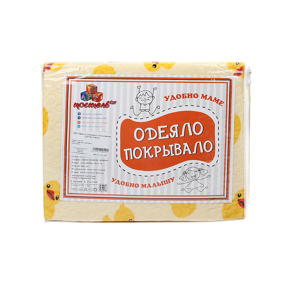 Трикотажное одеяло предназначается для самых маленьких. Поверхность изделия декорирована принтом в виде небольших уточек, который даже после множества стирок не утратит своей яркости. Покрывало не линяет, не деформируется, его не нужно отпаривать или утюжить после стирки. Экологичный состав из натурального хлопка приятен к коже ребенка, а сам материал мягок на ощупь. Размер одеяла – 100х140см.