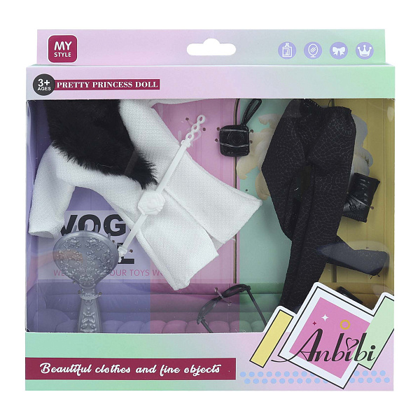 Набор одежды для куклы включает стильное пальто с мехом, черные брюки, ботинки и аксессуары. Пальто белого цвета украшено черным мехом на воротнике, что придает ему элегантность и современный шарм. Черные брюки сочетаются с детализированными ботинками.
