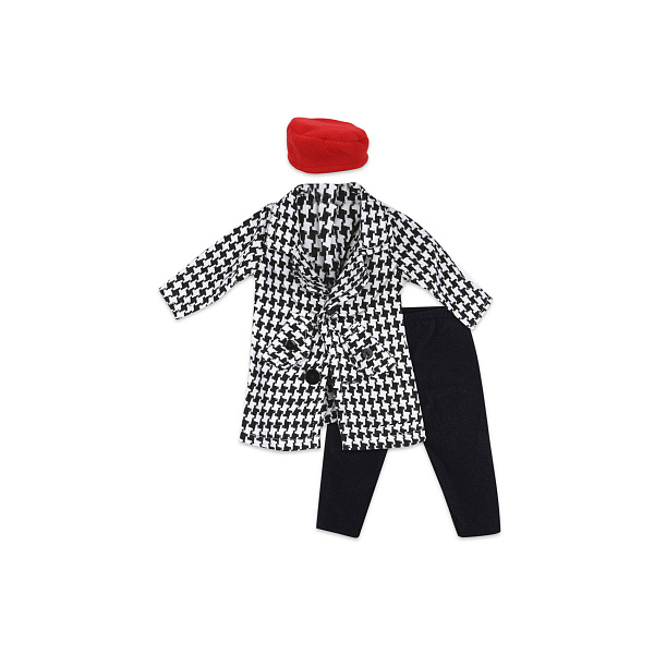 Клетчатый плащ, сочетающийся с черными брюками, создает реалистичный и модный образ. Красная шляпка добавляет яркости и веселья. Все элементы одежды сшиты из качественного текстиля.