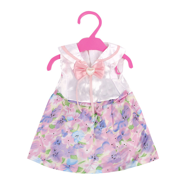 Этот набор одежды для пупса включает милое платье для кукольных игр. Верх выполнен из белого блестящего материала с воротничком и бантиком с сердечком, нижняя часть — из яркой цветочной ткани. Платье на розовой вешалке для удобного хранения, застежка на липучке обеспечивает легкое одевание и снимание.