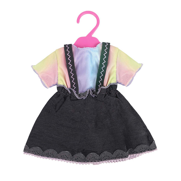 Этот набор одежды для пупса включает черный сарафан с кружевным низом и разноцветную футболку. Лямки сарафана украшены фиолетовой вышивкой. К костюму прилагается розовая вешалка для удобного хранения. Застежка на липучке обеспечивает легкое переодевание игрушки.