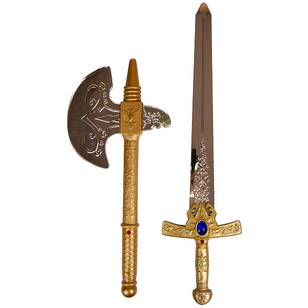 Набор игрушечного оружия для ребенка от 3 лет состоит из меча и топорика. Игрушки изготовлены из пластика, который имитирует блеск настоящего металла, и украшены стразами в виде драгоценных камней.