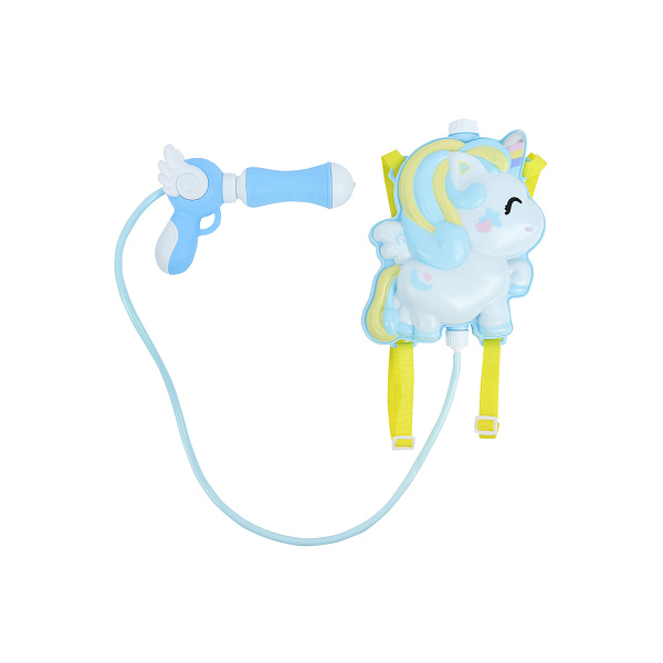 Эта модель может быть использована в качестве игрушки или водного пистолета. Изделие исполнено в виде забавного пони бело-голубого цвета с желтой гривой. Фигурка пони соединяется с баллоном, который служит для запуска водяной струи. Вода заливается в горловину резервуара, помещенного внутри фигурки пони. Специальные ремешки позволят зафиксировать пони на кисти руки.