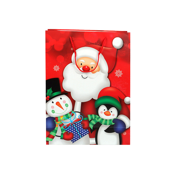 Ни один подарок не обходится без красивой упаковки и подарочного пакета. Бумажный пакет «Новогодние настроения» порадуют гостей в новогоднюю ночь. На лицевой стороне изображены главные герои праздника, которые есть в ассортименте: Дед Мороз с маленькими помощниками, веселый снеговик, олень и пухлый пингвиненок. Пакеты выполнены в торжественном красном цвете и дополнены контуром из блесток. Размер пакета 30х40см, он чудесно подойдет для упаковки небольших презентов и сладостей. Для дополнительного удобства по бокам имеются тонкие ручки в виде шнурков.