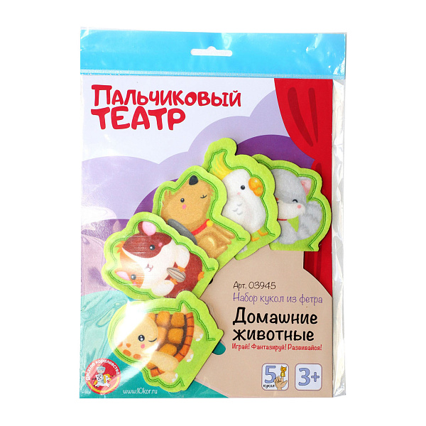 Познакомить малыша с домашними животными в игровой форме легко при помощи миниатюрного домашнего театра «Домашние животные». В него входят фетровые фигурки котенка, собаки, попугая, черепахи и хомяка. С ними можно придумать немало увлекательных игровых сюжетов. Таким образом развивается воображение, память и речь у детей, активируется моторика рук, улучшается координация движений. Предложить забаву можно ребенку старше 3 лет.