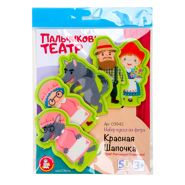 Чудесным способом провести семейный вечер является миниатюрная театральная постановка с Красной шапочкой. Надеть на пальчики фетровых кукол из набора сможет не только взрослый, но и ребенок. В комплект входит фигурка девочки, бабушки, дровосека, классического волка и волка, переодетого в костюм бабушки. Творческая деятельность положительно влияет на моторику рук, воображение, память, речь, логическое и пространственное мышление.