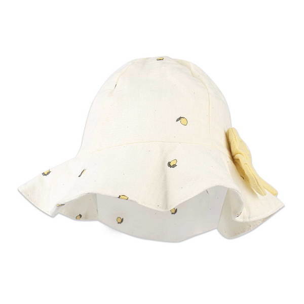 Панама для девочки выполнена в светлом кремовом оттенке с аккуратными мелким принтом в виде лимончиков, что придает изделию свежий и летний вид. Яркий большой бант желтого цвета, расположенный сбоку, добавляет шарма и делает панаму особенно заметной и стильной. Широкие поля обеспечивают хорошую защиту от солнца, сочетая практичность и красоту.